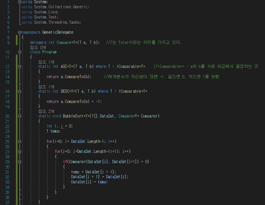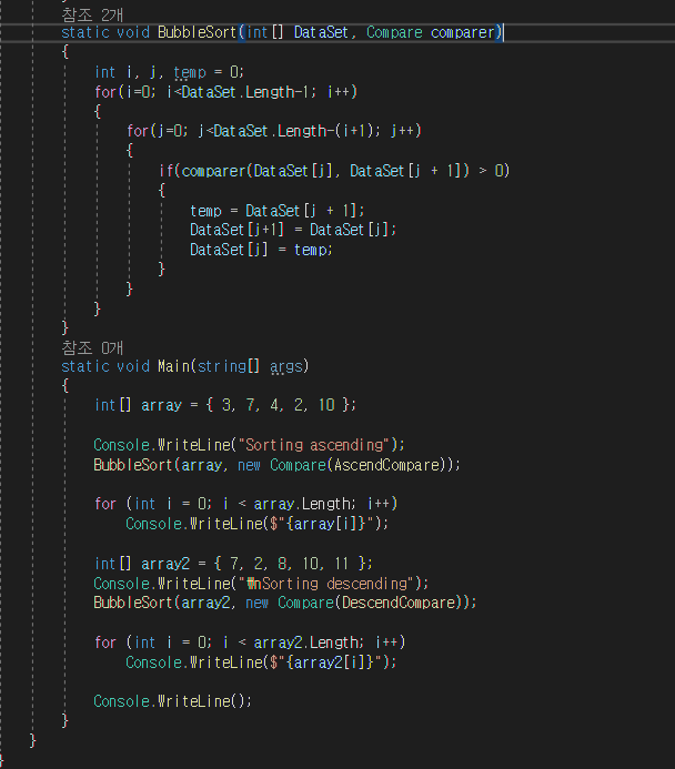 바로 이럴 때 대리자가 사용됩니다. 대리자는 메소드에 대한 참조이므로, 비교 메소드를 참조할 대리자를 매개 변수로 받도록 정렬 메소들르 작성해 놓으면 문제가 해결됩니다.