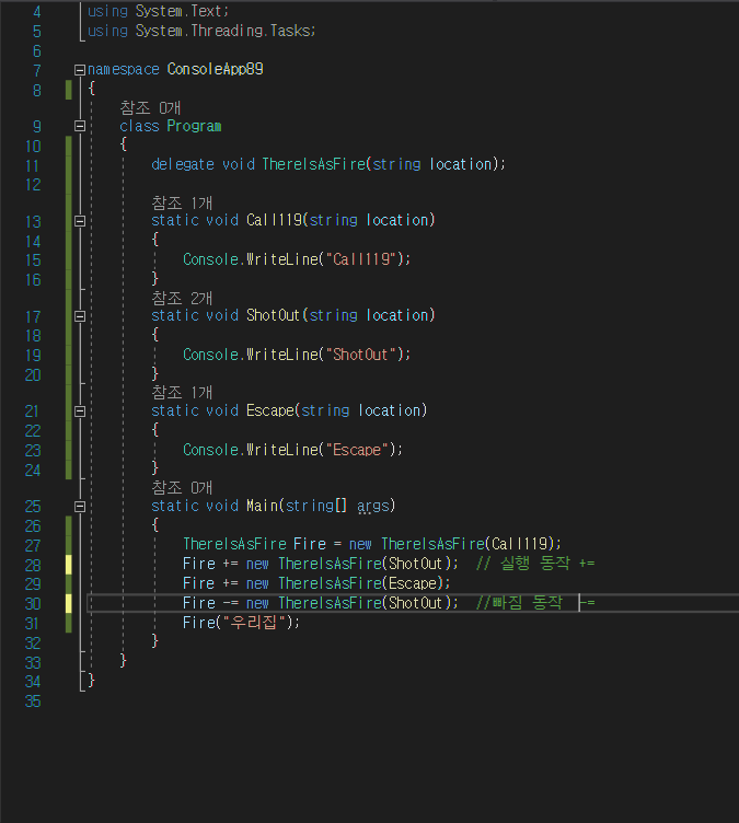 이렇게 선언한 대리자의 인스턴스를 만들고 이 인스턴스가 메소드의 구현이 담겨있는 코드 블록을 참조시킨다. 대리자의 인스턴스를 호출하면 자신이 참조하고 있는 코드를 실행하게 된다.