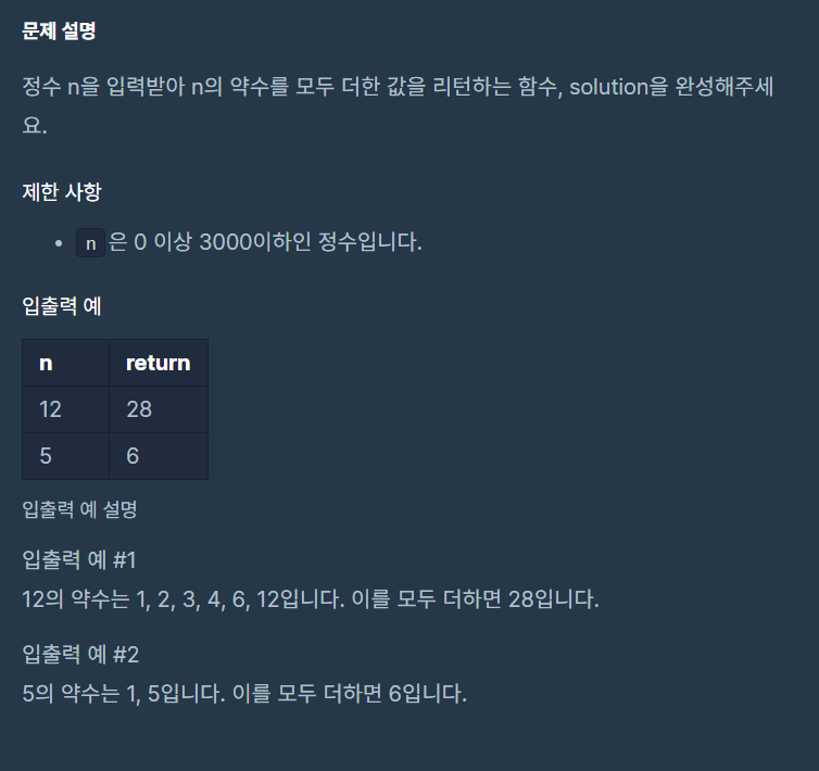 그리고 반복문 안에서 조건문if를 사용하여 n을 i로 나누었을 때 나머지가 0이되는 값이 약수이므로