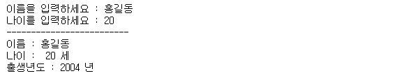 print("-------------------------\n" + "이름 : " + name +"\n" + "나이 : ", age, "세\n" + "출생년도 :", birth ,"년")
