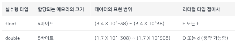 - 실수형은 디폴트형이 double이므로 float형을 지정하려면 숫자 뒤에 "F"를 붙여줍니다.