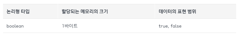- 논리형 데이터타입에서는 오직 true와 false만 허용합니다.