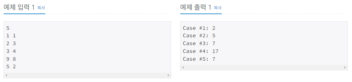 - 각 테스트 케이스마다 "Case #x: "를 출력한 다음, A+B를 출력한다. 테스트 케이스 번호는 1부터 시작한다.