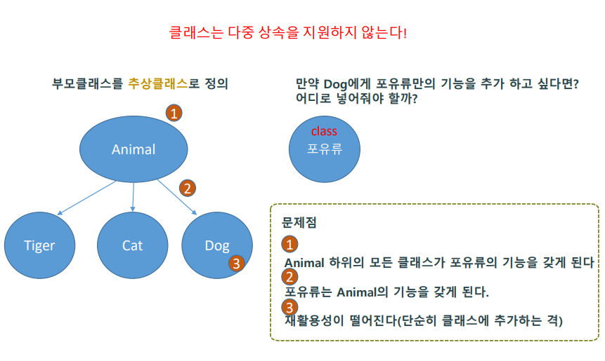 기존 클래스와 동일한 클래스를 포유류의 자식클래스로 만들어야함으로, 재활용성이 떨어지게 된다.