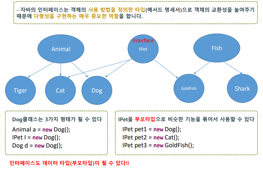 : 자바의 인터페이스는 객체의 사용방법을 정의한 타입으로 객체의 교환성을 높여준다.