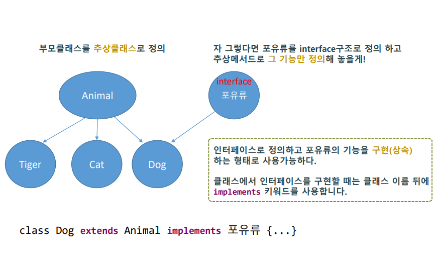 추상메서드를 이용해 해당 기능만 정의가 가능하다. - 인터페이스로 정의하고, 포유류의 기능을 구현(상속)하는 형태로 사용이 가능하다.