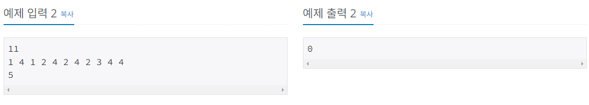 - 첫째 줄에 정수의 개수 N(1 ≤ N ≤ 100)이 주어진다. 둘째 줄에는 정수가 공백으로 구분되어져있다. 셋째 줄에는 찾으려고 하는 정수 v가 주어진다. 입력으로 주어지는 정수와 v는 -100보다 크거나 같으며, 100보다 작거나 같다.