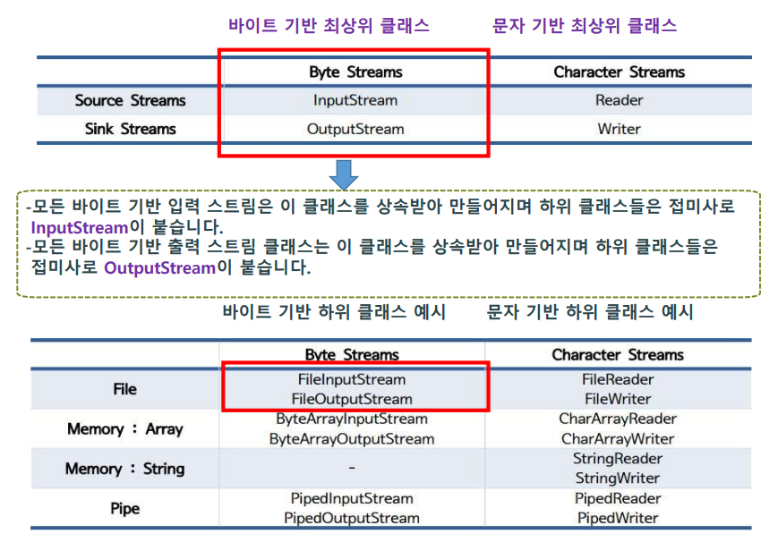 * 1. 파일을 읽을 때 사용하는 클래스는 FileInputStream클래스 입니다. 2. 1byte기반으로 데이터를 읽어들입니다. 3.