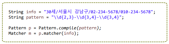 - Java.util Pakage의 Pattern 클래스의 matcher(), matchers() 메서드를 정규표현식 검증에 이용한다.