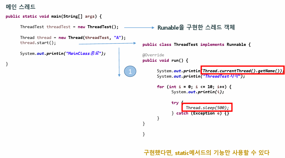 - Runnable은 인터페이스 이므로, 스레드 실행의 기능만 정의되어 있으므로 클래스내부에서