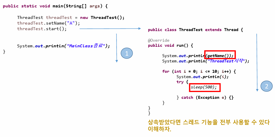 (1). Thread 클래스를 상속받아 run() 추상메서드를 재정의