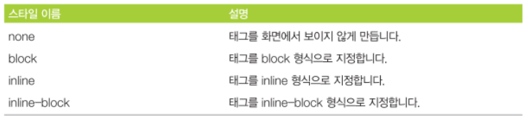 display 속성은 태그의 영역 표현 방식을 지정하는 속성으로 매우 중요한 속성 중 하나이다.