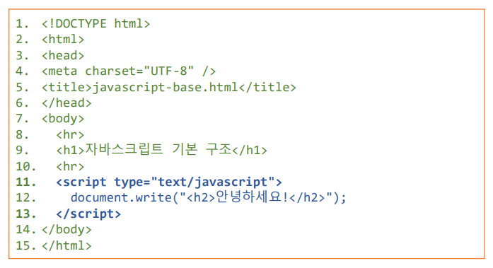 type 속성값으로 "text/javascript"를 입력 (HTML5)에서는 생략가능