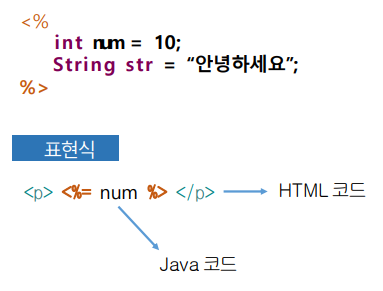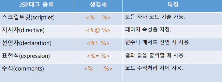 - HTML 코드안에 JAVA 코드를 삽입하기 위해서는 JSP 태그를 이용해야하며, 이러한 태그를 학습해야 한다.