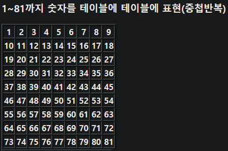 <h3>1~81까지 숫자를 테이블에 테이블에 표현(중첩반복)</h3>