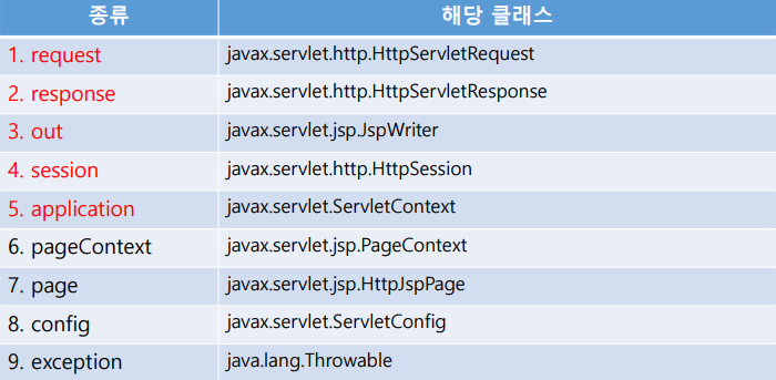 개발자가 JSP 파일 내에 객체를 생성하지 않고 바로 사용할 수 있는 객체가 내장 객체이다. JSP에서 제공되는 내장객체는 JSP 컨테이너에 의해 서블릿으로 변환될 때 자동으로 객체가 생성된다.