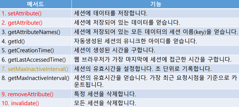 - JSP에서는 Session이라는 내장 객체를 지원하여 세션의 속성을 설정할 수 있다.