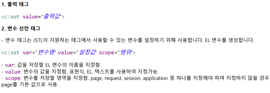 | c:out | t JspWriter에 내용 출력 |