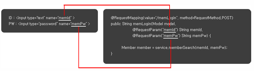 RequestMapping("memJoin")을 통해서 Controller로 화면에서 요청이 들어오게 된다.