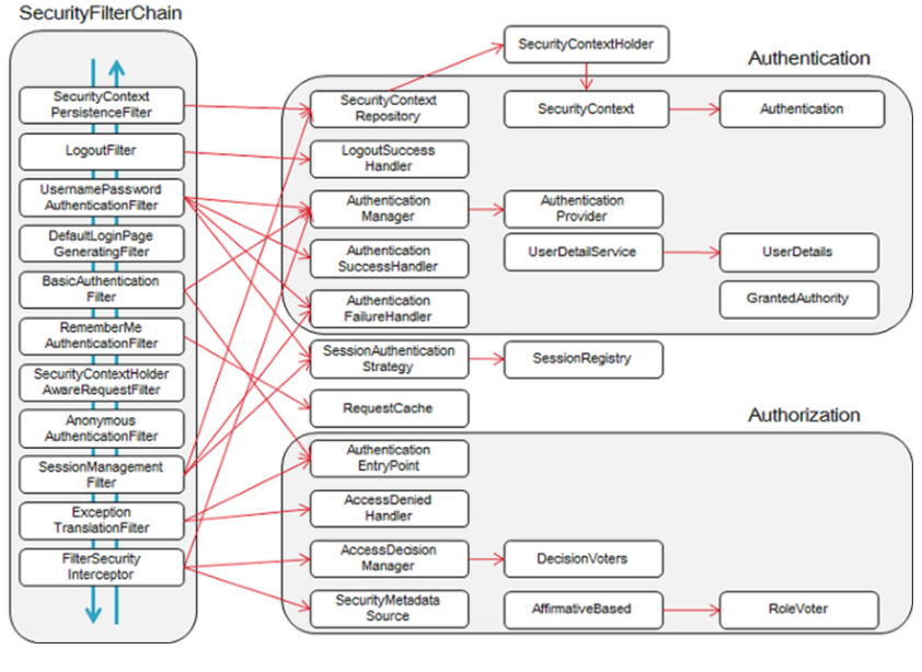 SecurityFilterChain은 인증을 처리하는 여러 개의 시큐리티 필터를 담는 필터 체인입니다. 또, 필터체인 프록시를 통해 서블릿 필터와 연결되고 어떤 시큐리티 필터를 통해 인증을 수행할지 결정하는 역할을 합니다.