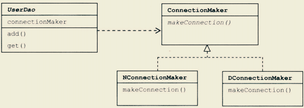 두번째. DB Connection을 제공하는 클래스가 어떤 것인지를 UserDAO가 구체적으로 알고있어야 한다는 점이다.