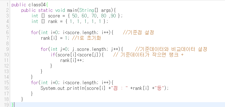 - 순위 배열을 1등으로 초기한 이후 기준점수를 두어 기준점수보다 작거나 클시 순위 변동 [ 1씩 증가 ]